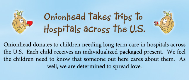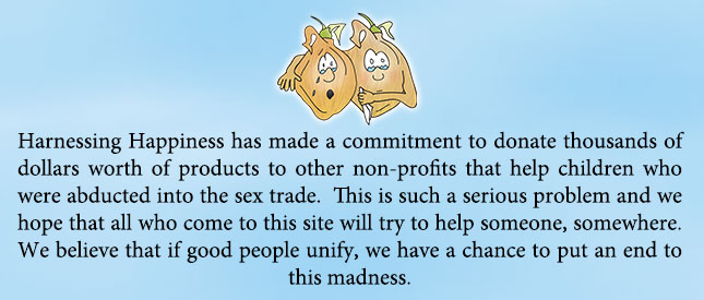 Our environment is a great concern of ours. Based on that consciousness Onionhead and Harnessing Happiness materials are printed on tree free, or 100% recycled paper with non-toxic ink. Because we are blessed to have a corporate sponsor who supplies the funds for all manufacturing and administrative costs, we are able to give 100% of the proceeds from the sales to our projects. Some of our projects include sending free products to adoption agencies, hospitals, third world countries, abuse centers and schools.